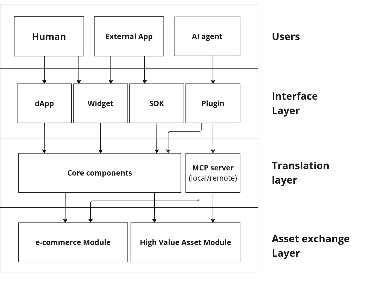 The interface layer comprises dApps for human interaction, widgets and SDKs facilitating integration with external applications, and plug-ins designed specifically for use by AI LLMs and agents. This outermost layer creates a consistent experience across platforms and enables frictionless adoption for both human users and autonomous systems.